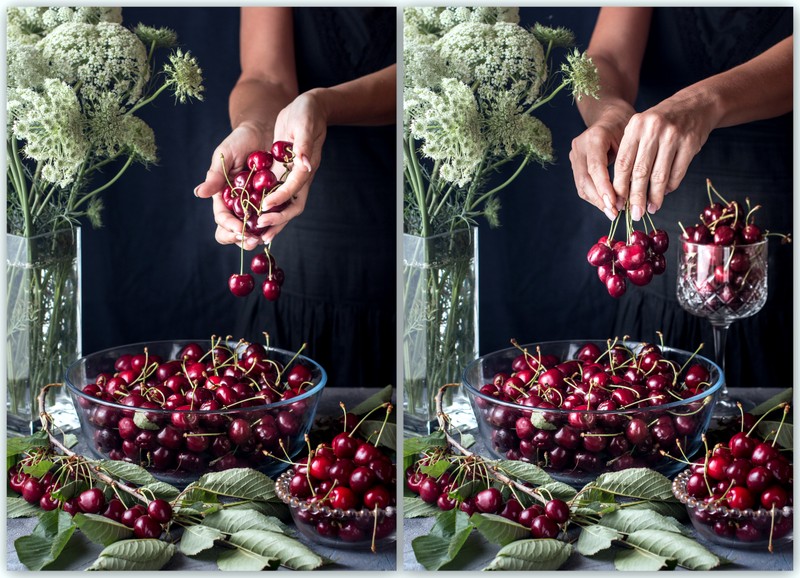 У черешни удалить косточки, разрезать каждую ягоду пополам.