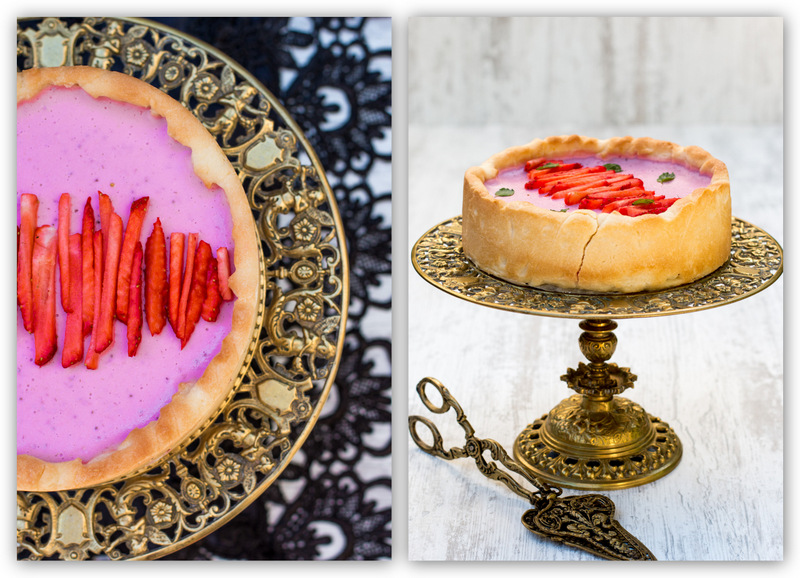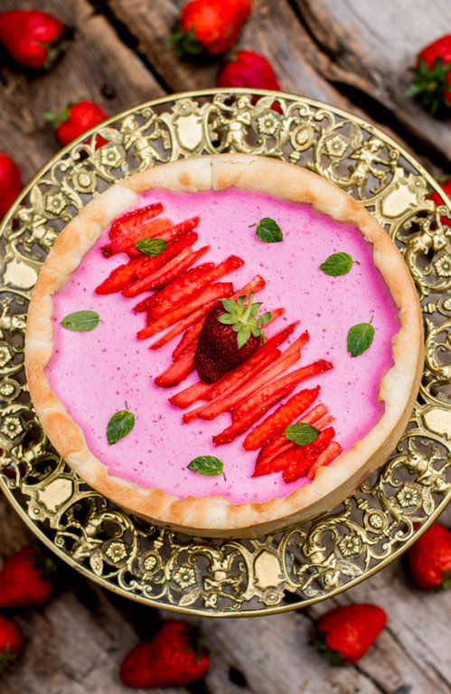 Отложите в сторону две клубники для украшения кростаты. Остальную клубнику порежьте на мелкие кусочки, положите в сотейник вместе с 60 гр сахара и соком, отжатым из лимона, кожуру которого вы использовали для теста.