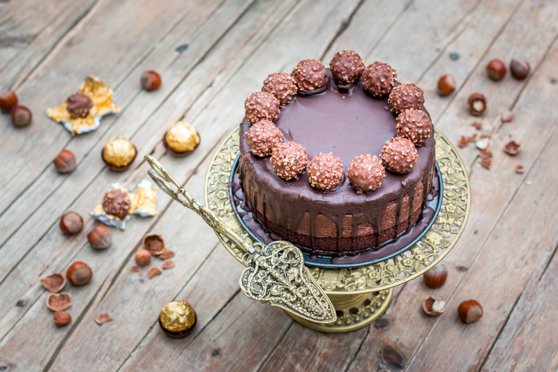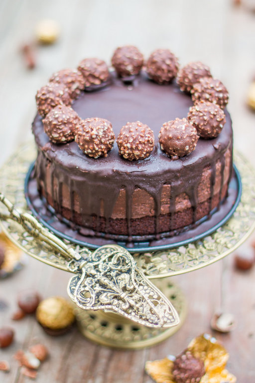 Украсьте торт по своему вкусу. Можно использовать конфеты «Ферреро Роше», можно украсить вафельной крошкой (для этого вам нужно ещё около 100 гр вафель), можно присыпать измельчёнными орехами.