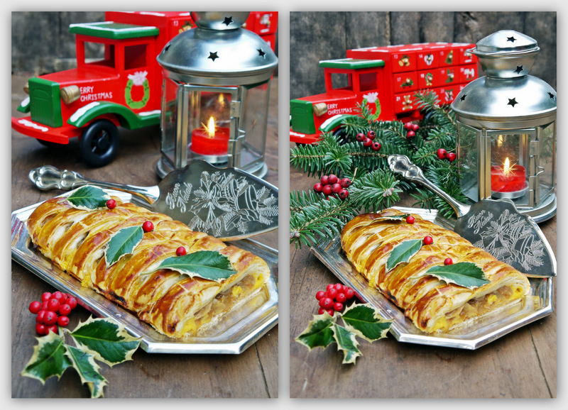 Раскатайте слоёное тесто в пласт толщиной 3 мм размером 30 на 25см и поместите его на противень, накрытый бумагой для выпечки. Разделите зрительно на 3 части и нарежьте боковые части на косые полоки с промежутками в 2см.