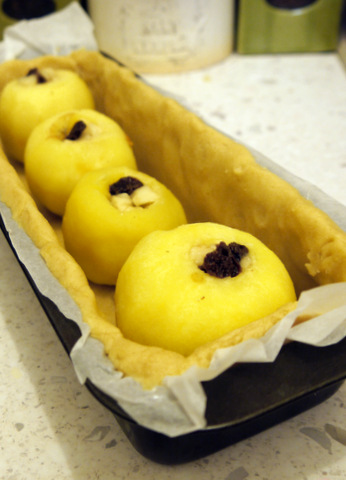 Поместите фаршированные яблоки на тесто.