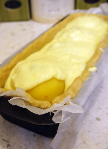 Раскатайте песочное тесто в пласт 0,5 мм толщиной и перенесите его в форму для выпечки.