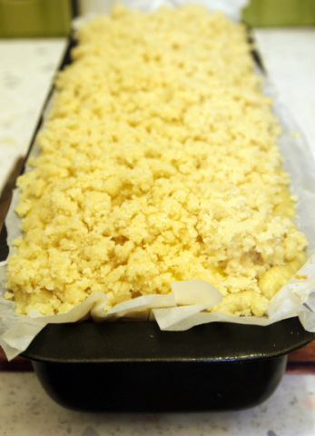 Пока пирог печётся, приготовьте крошки. Для этого смешайте миндаль, муку, сахар, ваниль и сливочное масло до получения рассыпчатой массы.