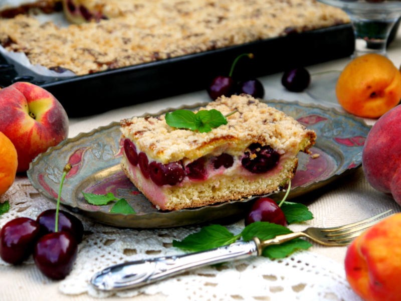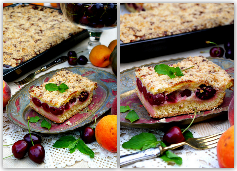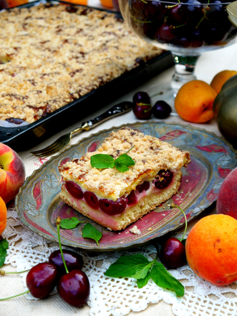 Приготовьте крошки. Смешайте руками муку с мягким маслом и сахаром до образования крошек. Посыпьте пирог крошкой и выпекайте при 180° около 45-50 минут.