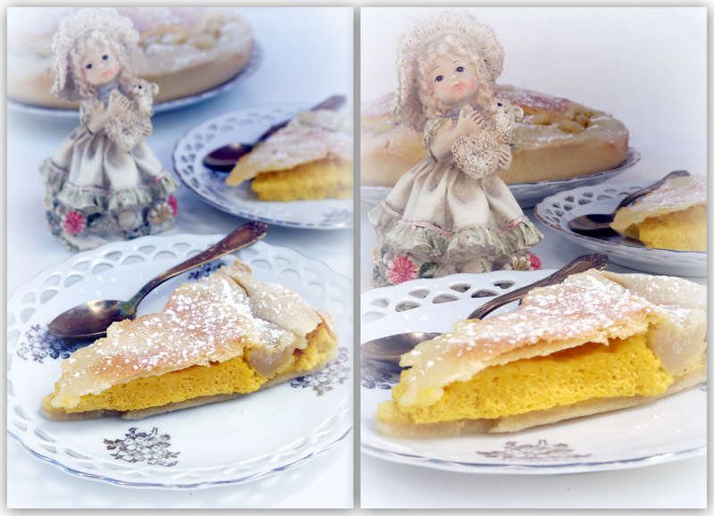 Влейте крем, разровняйте и накройте вторым кругом теста. Защипите края.