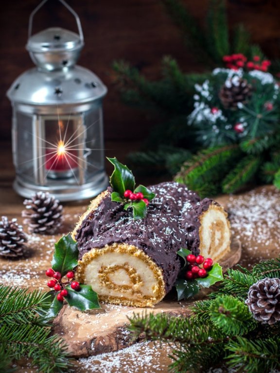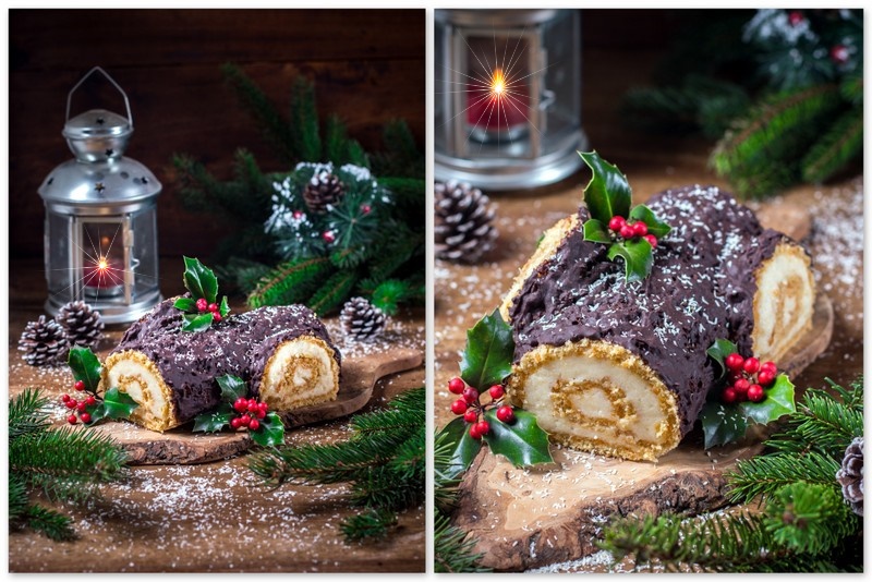 Для варианта "Полено" 100 гр тёмного шоколада растопить в 2-3 ст.ложках молока. Масса долна быть густая и не течь. Украсить ей полено, создав эффект коры.