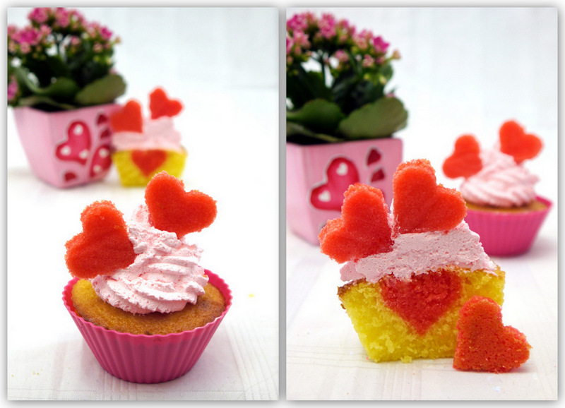 Приготовить формочки для маффинов. Наполнить их на половину тестом и вставить красное сердечко.