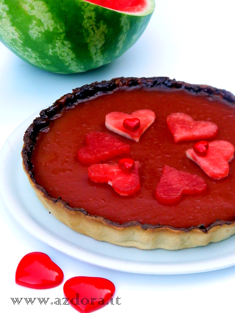Такого я точно ещё никогда не ела и не делала. Чтобы использовать арбуз для изготовления торта! Это надо было до такого додуматься! Конечно, я не могла не опробовать этот рецепт. Вкус интересный, необычный, на любителя. Вот уж точно, как говорится, кому нравится арбуз, а кому-свиной хрящик. Нам понравилось. Консистенция очень приятная, похожа на фруктовое желе. Шоколад как нельзя к месту. Попробуйте. Этот тарт стоит того. Я уже подумываю исполнить его в мини-варианте, типа пирожных, и добавить к соку арбуза немного ликёра Cointreau.