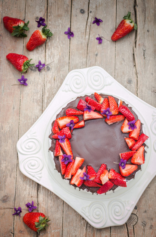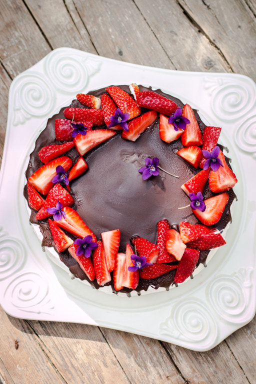 Взбить оставшиеся 150 мл сливок. Обмазать торт сливками. Можно залить шоколадной глазурью и украсить свежей клубникой.