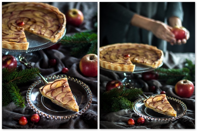 Разложить ломтики яблок на тесте, начиная с внешнего круга, в форме лепестков.