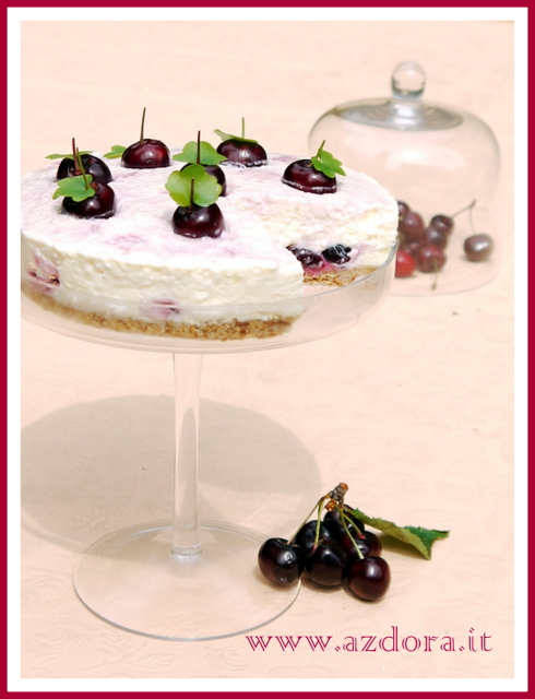 Заполнить форму для торта сырной массой. С помощью оставшегося от черешни сиропа нарисовать разводы на поверхности торта и поставить в холодильник минут на 15 или пока масса не начнёт застывать. Теперь, для красоты, можно полу-погрузить в массу целые ягодки черешни и вернуть в холодильник ещё на пару часов.