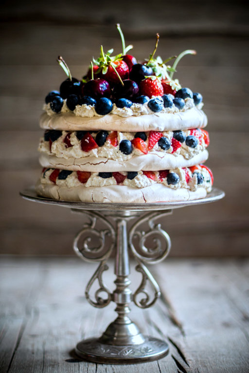 Остывшие лепешки “безе” покрыть тонким слоем крема, на крем — слой фруктов, и положить одну на другую.