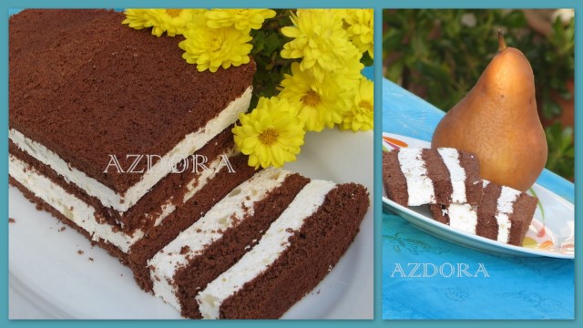 Баварезе - это итальянское (баваруа -Французское ) название баварского крема, а также общее собирательное название десертов, в горячую основу которых добавляют желатин, остужают и вмешивают сливки. Распространение получили баварезе с добавлением кофе, шоколада, более диетические варианты – на фруктовых соках с ягодами внутри, ореховые и многослойные варианты. Смесь вливают в декоративные формы, при подаче украшают.Классические варианты десертов баваруа не содержат яичных белков.Баварезе не относят ни к муссам, ни к суфле, ни даже к желе.И когда читаешь рецепт любого баварезе, приготовление кажется довольно хлопотным: свари, разведи, взбей, смешай. На самом же деле ничего сложного в нём нет.В тёплую основу вводится желатин, а когда эта смесь остынет, в неё аккуратно вмешивают взбитые отдельно сливки.Груши с шоколадом-это классическое сочетание.Можно было ввести шоколад в сам грушевый баварезе, но я пошла другим путём и поместила грушевый баварезе между шоколадных бисквитов.