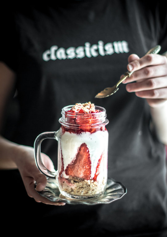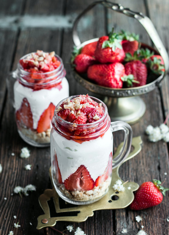 Крем перенести в кондитерсикй мешочек. Выдавить его в баночки так, чтобы не сдивнуть клубнику. Можно чередовать слой крема со слоем маринованной клубники, а можно выложить клубнику только сверху одним слоем.