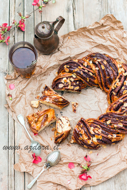 Подошедший крендель смазать взбитым яйцом или яичным желтком и украсить рубленым, нарезанным или целым миндалём. Выпекать в духовке при средней температуре в течение 30-40 минут. Вначале, до того как крендель подрумянится, температура должны быть немного выше. Если крендель начинает сверху пригорать, то его следует накрыть влажной пергаментной бумагой и понизить темпераьуру в духовке. Готовый крендель выложить на пирожковую доску или решётку и накрыть салфеткой. Остывший крендель посыпать через сито сахарной пудрой.