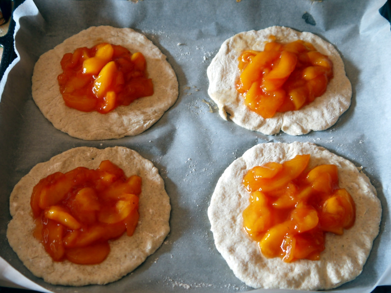 Выложить на каждую из 4 лепёшек начинку из персиков.