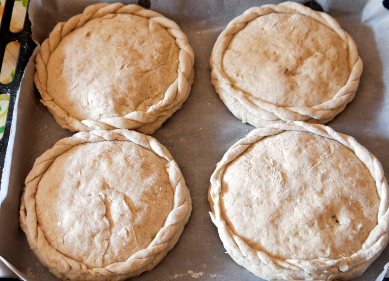 Раскатать 8 частей в лепёшечки по 1/5 см толщиной (Скалкой пользоваться не обязательно.Тесто хорошо формируется руками). Перенести 4 лепёшки на противень, накрытый бумагой для выпечки.