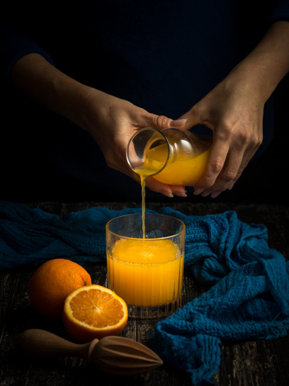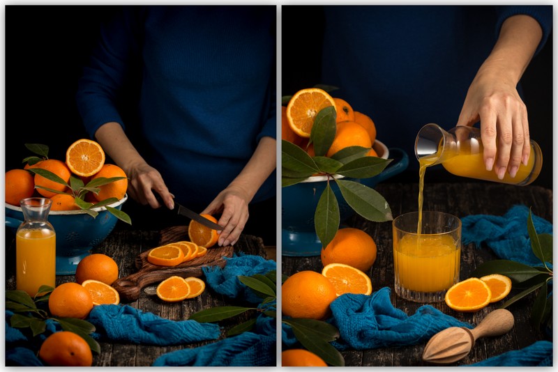 Тем временем, срезать с апельсинов белые шкурки и прожилки и каждую дольку разрезать пополам.
