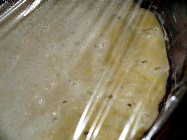 На фото видно, что плёнка запотела. Значит, мама дышит. Ещё видно, как масса расплылась по миске и начала пузыриться.