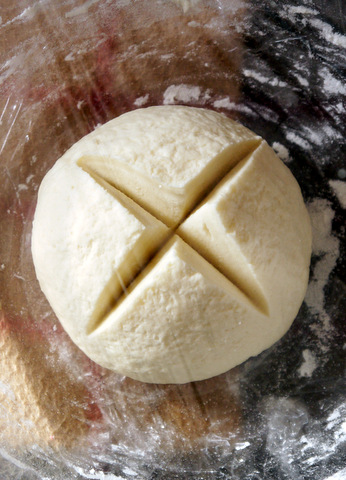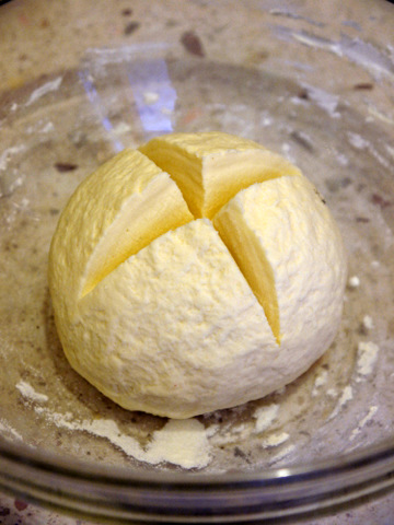 Важно хорошо вымесить тесто, минут 10. Хорошо вымешанное тесто, когда вы надрежете его накрест, откроется "цветком" в местах надреза (как на фото).