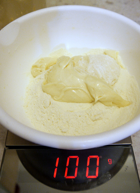 Можно видеть, что она представляет собой очень пористую массу. Берём 100 гр муки и добавляем в неё 100 гр мамы: