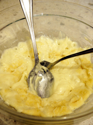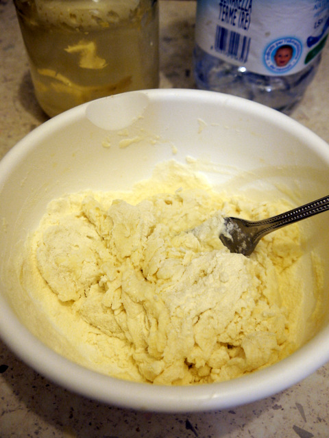 Смешиваем вилкой муку с мамой и вливаем 50 мл воды.