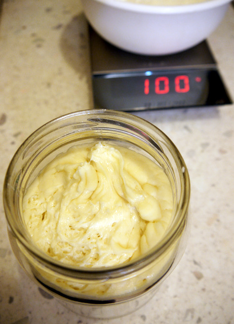 На фото сверху видно, что из себя представляят мама в конце второго дня перед первой подкомкой (при более низкой, чем у меня, температуре, через 3 дня, примерно). Это довольно жидкая,пористая, пузырчатая и тягучая масса. С помощью ложки я отделила от массы 100 гр и подкормила её. Снова вымесила мягкое эластичное тесто, снова поместила его в чистую стеклянную банку (или миску), накрыла плёнкой и убрала в тёплое место.