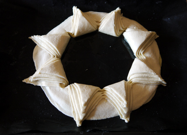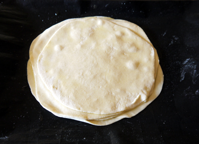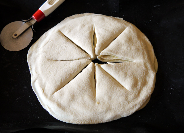 Теперь острым ножом или колёсиком разделите сложенные одна на другую лепёшки на 8 частей. Прорезайте почти до самого края, но очень осторожно, чтобы не разорвать круг.