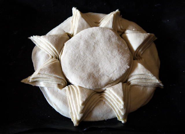 Точно так же раскатайте оставшиеся 5 маленьких шариков в лепёшки, промажьте их маслом и сложите одна на другую на рабочей поверхности. Размер этих лепёшек должен соответствовать отверстию, образовавшимуся после того, как вы выверните лепески первых 5 лепёшек наружу. Поместите стопку маленьких лепёшек в центр.