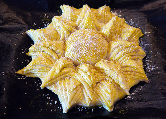 Смажьте полученный цветок желтком и посыпьте семенами кунжута.
