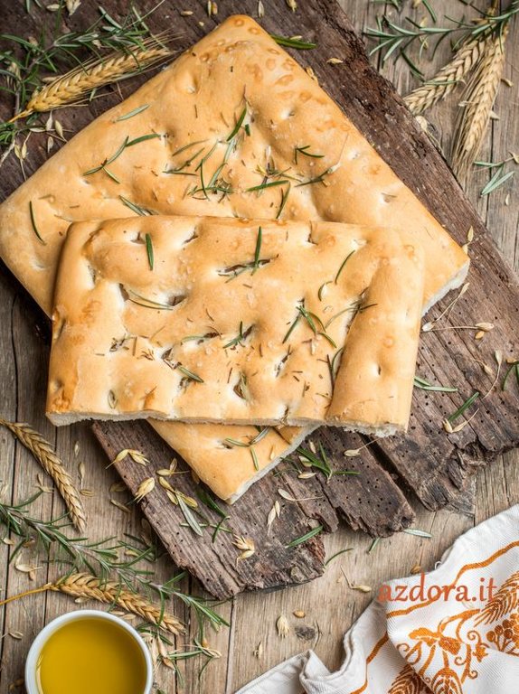Смазать верх фокаччи ст.ложкой оливкового масла и сбрызнуть водой из распылителя. Присыпать сверху крупной солью и оставить на 70-80 минут. За 30 минут до начала выпечки включить духовку на 220° . Противень с фокаччей должен быть установлен по центру духовки.Выпекать около 15 минут,пока поверхность фокаччи не зарумянится. Затем снизить температуру до 180° и выпекать ещё 15-20 минут. Достать готовую фокаччу и поставить её в вертикальное положение, чтобы она отдала всю влагу. Фокаччу можно резать и подавать, как только она приобрела комнатную температуру.