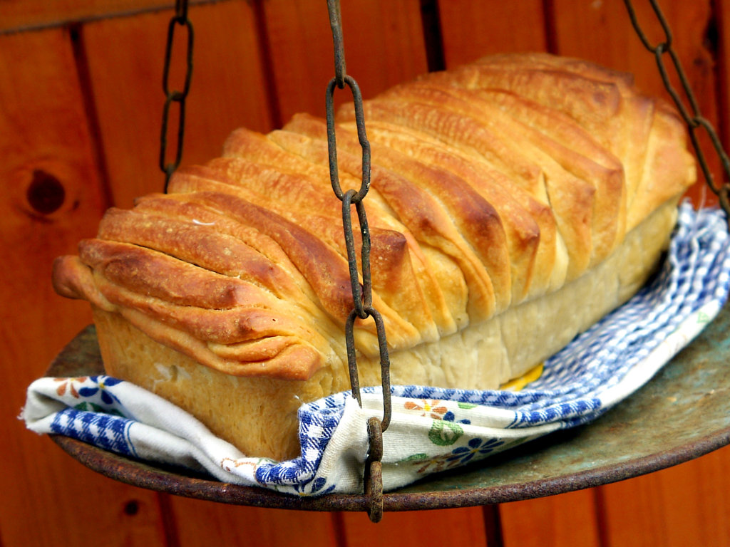 Приготовить форму для кекса в 25 см. Выложить её бумагой для выпечки. Поставить под углом. Выкладывать квадратики теста вертикально один за другим (лучше ставить их слегка вкривь и вкось, тогда готовый хлеб будет ещё красивее). Когда закончатся все квадратики, форма ещё не будет заполнена до конца. Вставить по бокам скрученную бумагу для выпечки или салфетки, которые нужно будет удалять по мере того, как хлеб начнёт подниматься.