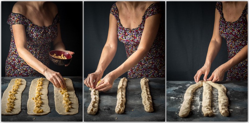 Расложить на пергаменте три части косы с начинкой, смазать их яцом
