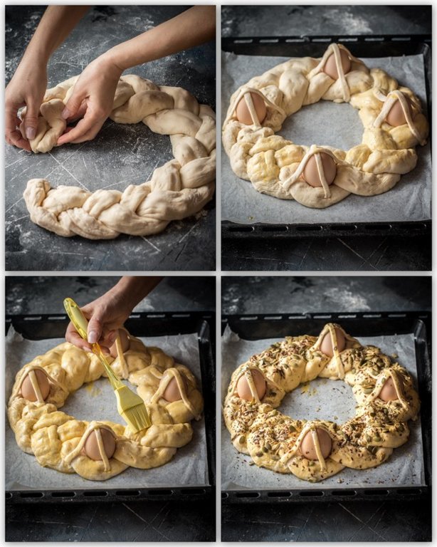 Оставить минут на 15-20, чтобы коса слегка поднялась и выпекать при 180° около 40-50 минут. Чтобы яйца не треснули, не открывайте дверцу духовки во время выпечки.
