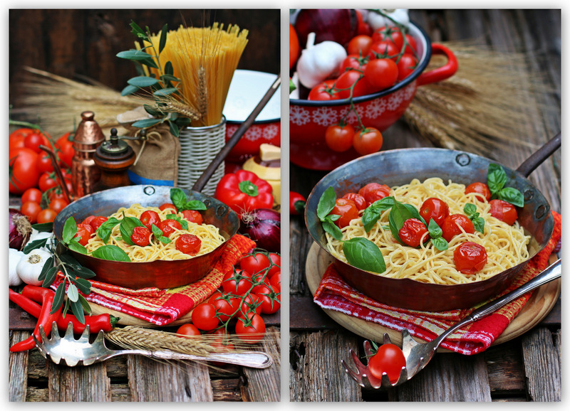 Spaghetti al pomodorini e basilico. Спагетти с помидорчиками и базиликом