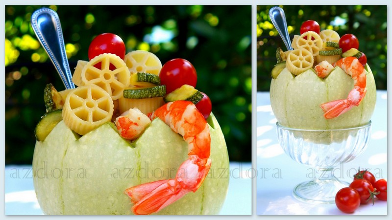 Для подачи я взяла большые круглые цуккини сорта «Ницца». Срезала у него шляпку и выскоблила внутри. Они уже переспелые, поэтому мякоть полна семян и уже не такая вкусная, как у маленьких, и они годятся только в декоративных целях. Наполнила цуккини салатом.