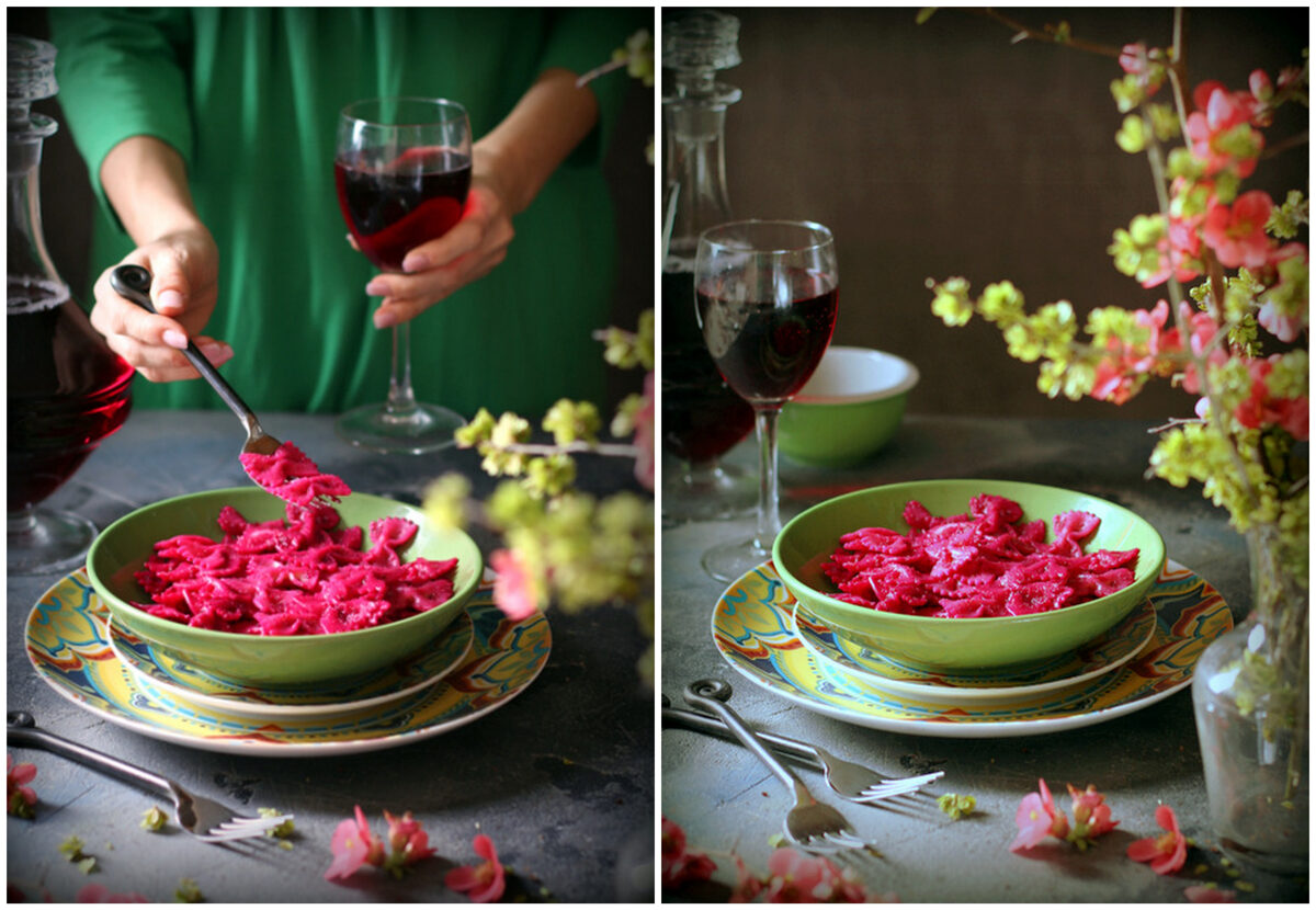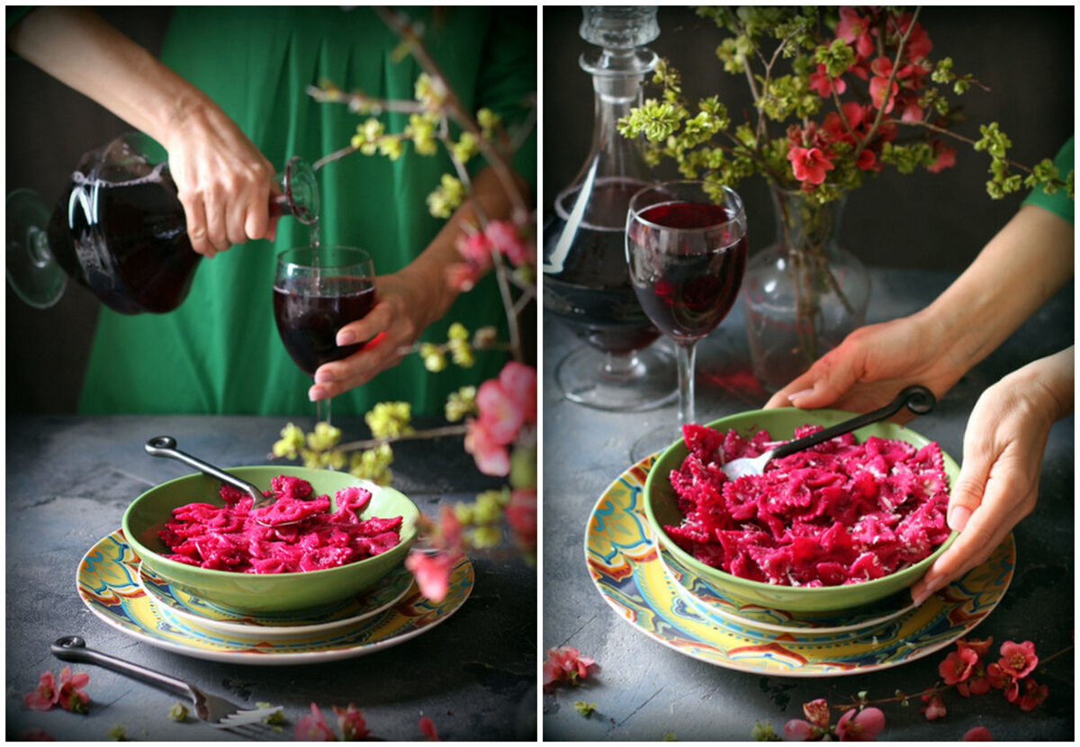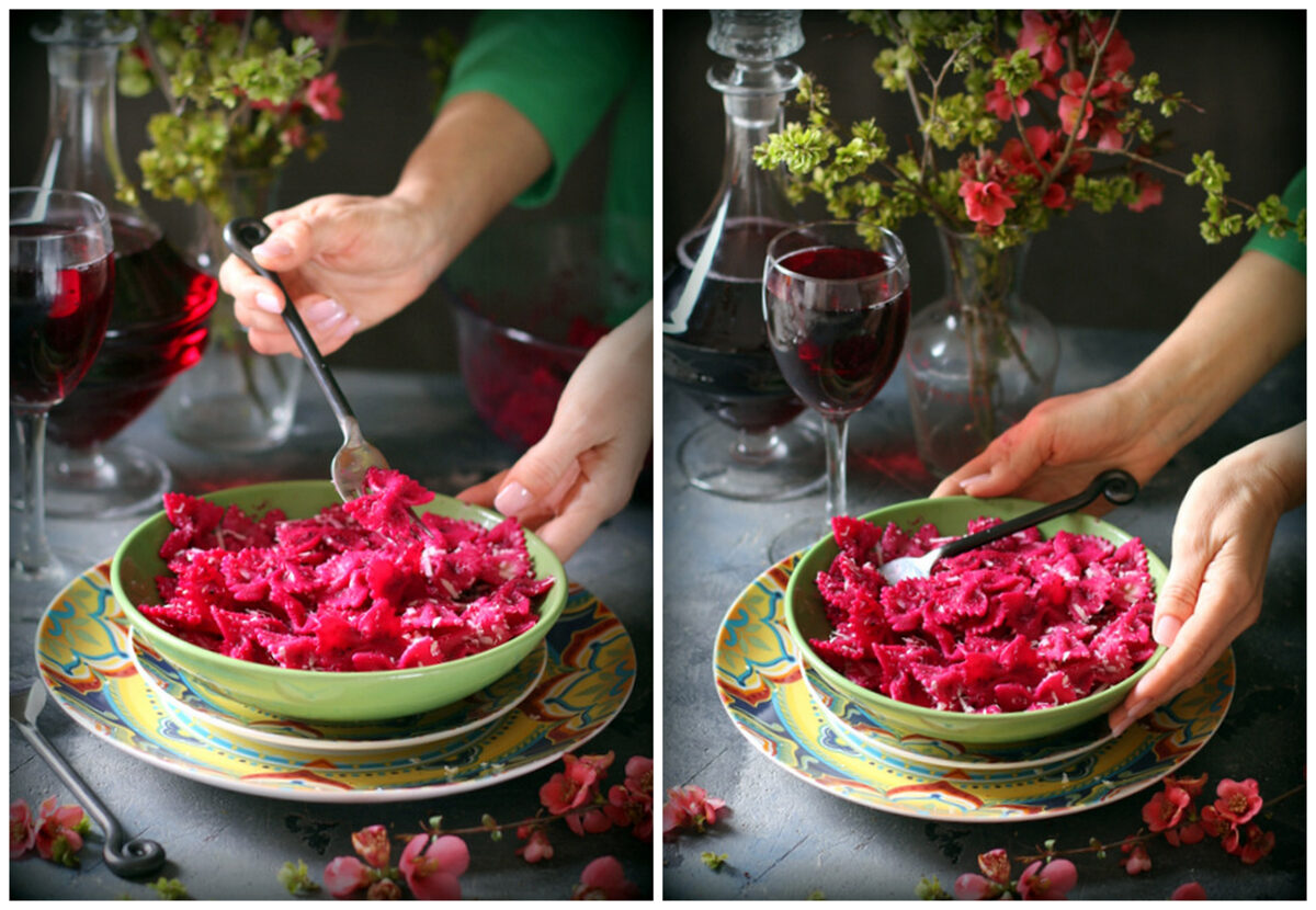 Этот рецепт принадлежит одному очень знаменитому итальянскому человеку - Уго Тоньяцци. Был он не только блистательным актёром, но и редким гурманом и отменным кулинаром и говорил про себя, что в его жилах течёт кровь, вперемешку с томатным соусом. Но больше всего мне нравится диагноз, который он себе ставил : спагеттит. Так вот, для всех больных спагеттитом этот уникальный рецепт: божественно вкусные бабочки с соусом из варёной свёклы (в оригинале рецепт называется Farfalle fuxia).