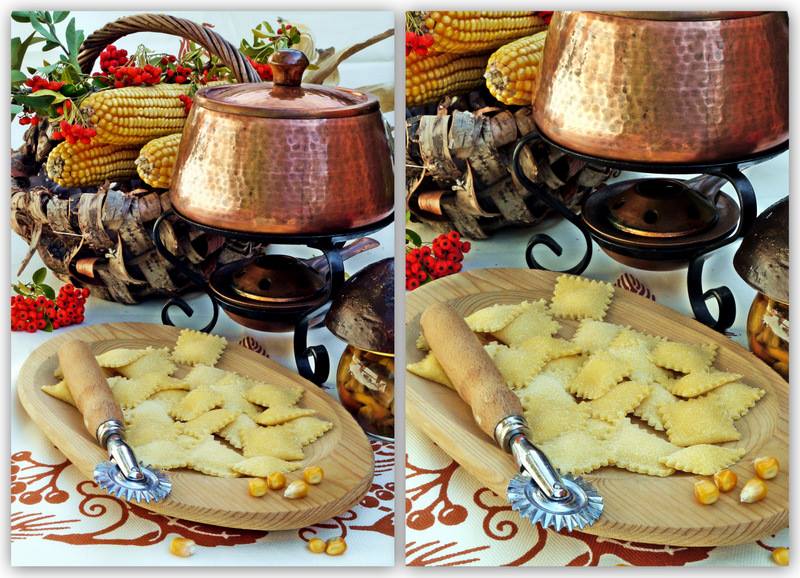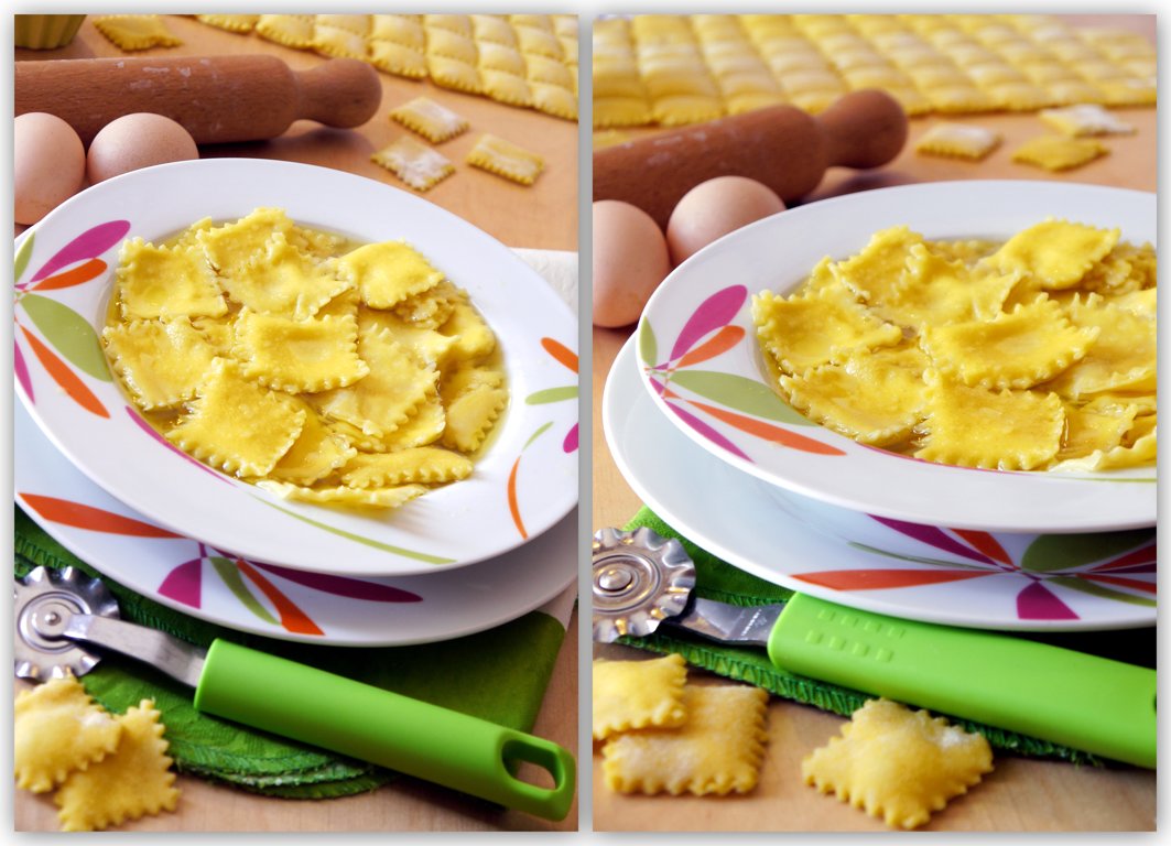 «Равиоли» — это общее название пасты с начинкой, квадратной или круглой формы, но может она быть и в форме полумесяца или даже, по случаю, других замысоватых форм как, например, сердечки, цветочки или звёздочки. Тут уж каждый сам выбирает, следовать традиции или подключить свою фантазию.