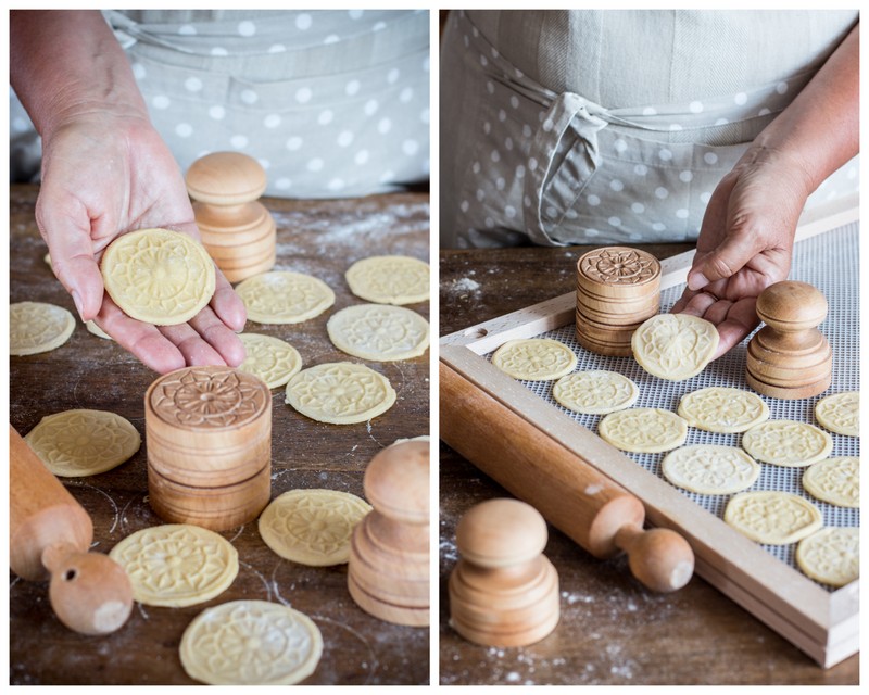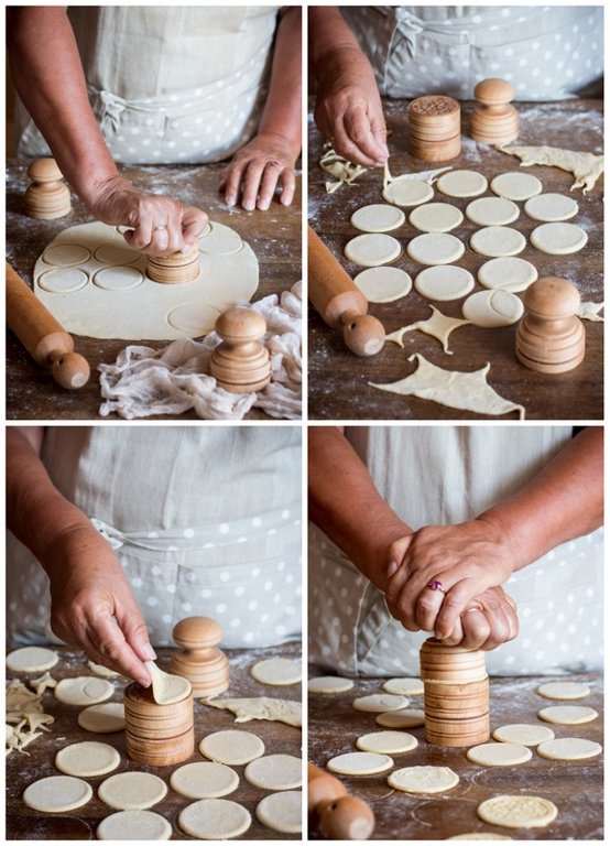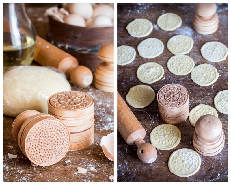 Той частью приспособления для корцетти, которое предназначено для резки, нарезать тесто на кружки. Оставить готовые кружки подсохнуть на рабочей поверхности минимум минут 15 с одной стороны, затем перевернуть их и подсушить с другой. Это нужно для того, чтобы корцетти не прилипли при штамповке к печать, т. е. дополнительное использование муки нежелательно.
