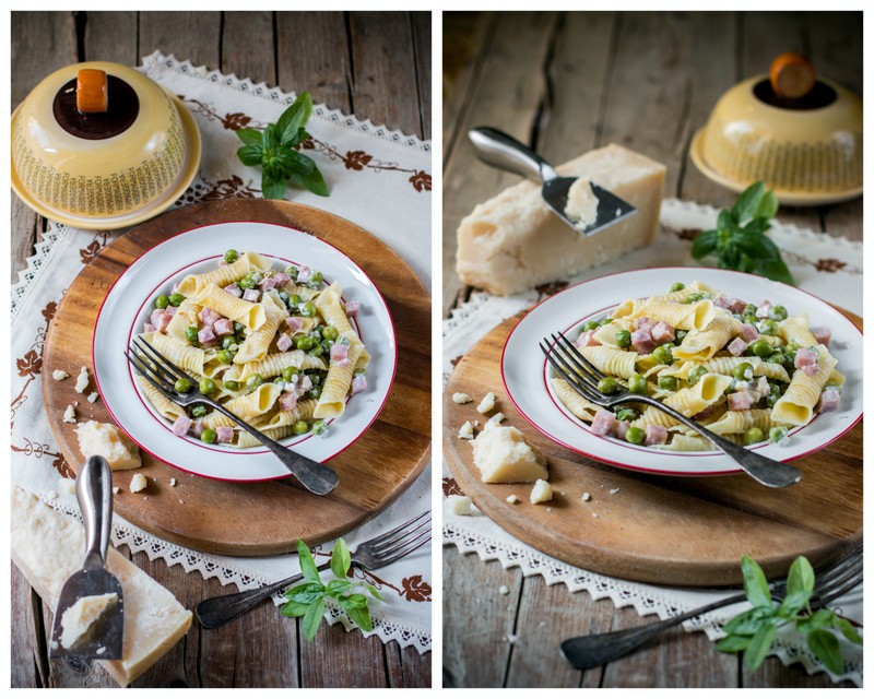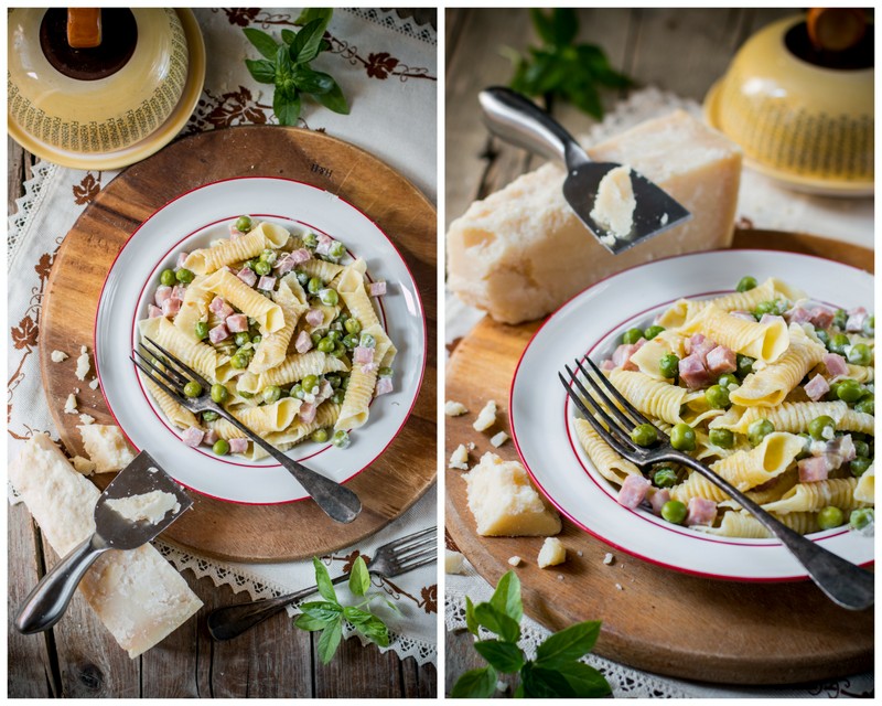Когда горошек готов, добавить прошутто, порезанное небольшими кубиками. Согреть все вместе и влить сливки. Поварить пару минут и соединить с отваренными al dente гарганелли. Перемешать, посолить, поперчить по вкусу. Подать, посыпав тертым пармиджано.