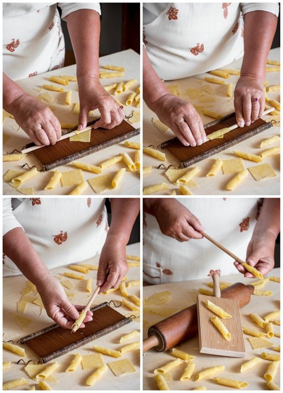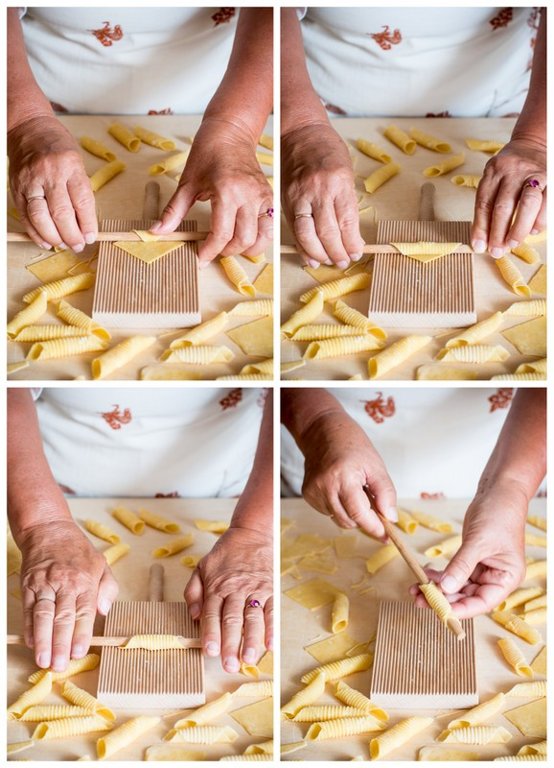 Каждый квадратик положить наискосок, намотать на палочку и прокрутить по гребешку. (Внизу на фото можно видеть два способа: старинный и современный, с использованием гребешка для ньокки и расчески от ткацкого станка). Не нужно сильно нажимать на палочку!