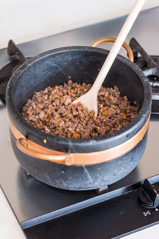 Затем добавьте фарш и дайте ему подрумяниться на довольно большом огне.