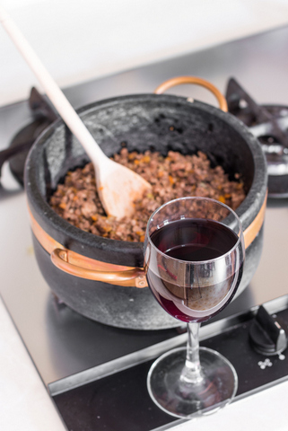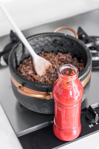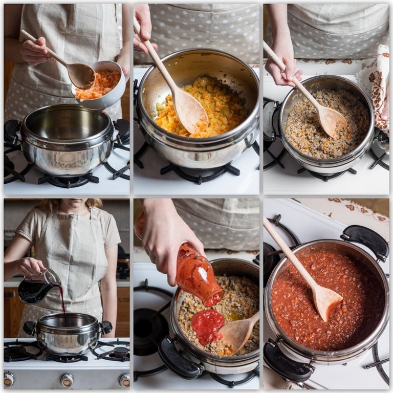 Добавьте томатный соус и через пару минут - бульон. Посолите, поперчите по вкусу и оставьте на самом маленьком огне минимум на 2 часа, помешивая и добавляя, если необходимо, бульон. Соус должен еле-еле побулькивать.
