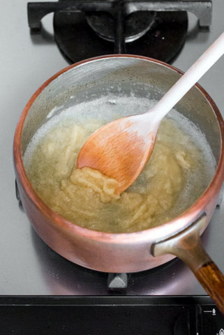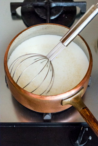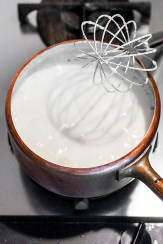 Варите соус на среднем огне, постоянно помешивая венчиком, пока он не загустеет и не приобретёт кремообразную структуру.