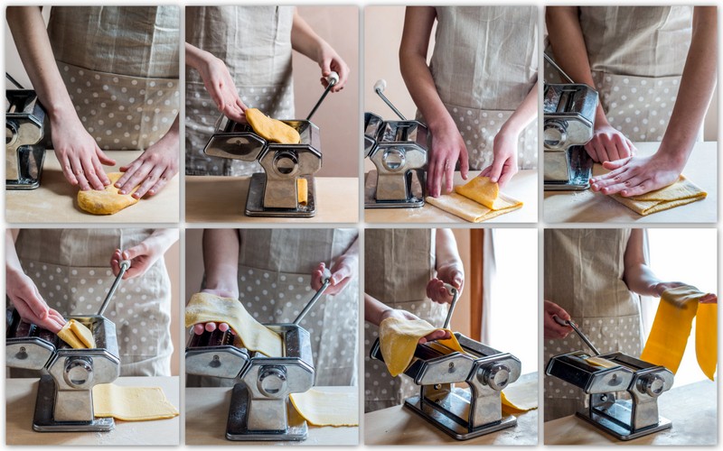 Теперь, каждый раз, когда вы будете пропускать пласт в промежуток между валиками, уменьшайте промежуток на один миллиметр, поворачивая регулятор. Правой рукой быстро поварачивайте рукоятку, а левой рукой поддерживайте пласт, выходящий из машинки, и слегка приподнимайте его. Каждый раз пласт будет становиться всё тоньше и длиннее.