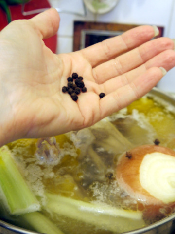 Как только пена перестаёт образовываться, убрать огонь. Теперь можно бульон слегка посолить. Именно слегка, потому что вода немного, но выкипит в процессе варки и, если сразу добавить много соли, можно пересолить бульон, а нам это ни к чему. В крайнем случае, в конце варки бульон всегда можно досолить по вкусу.