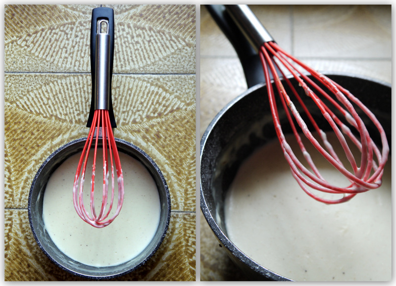 Теперь добавить тёплое молоко, хорошо перемешать и вернуть кастрюлю на тихий огонь.