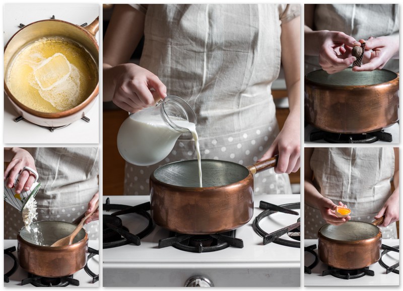 Растопить сливочное  масло, снять его с огня и добавить муку, постоянно помешивая. Я просеиваю её через сито. Обратите внимание, прежде чем добавлять муку, нужно масло снять с огня. Это важно,т.к. в противном случае образуются очень неприятные комочки, которые вы не сможете расстворить даже молоком.