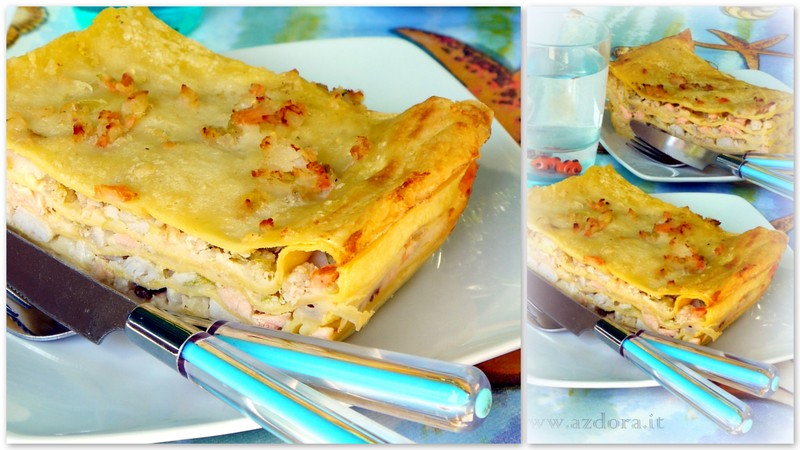 Начать собирать лазанью. Смазать дно формы небольшим количеством соуса и выложить первый пласт пасты. Распределить по нему соус, присыпать тёртым сыром, выложить слой рыбы, присыпать молотым розовым перцем. Повторить, насколько хватит ингредиентов. Закончить слоем пасты, присыть тёртым сыром и запекать при 180° около 20-25 минут.
