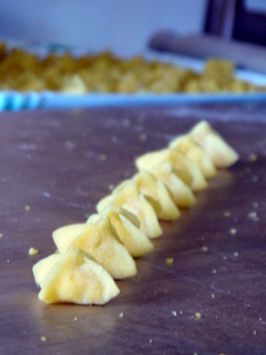 Раскатать тесто в тонкий пласт и нарезать на квадраты 4х4 см. Не нарезать сразу всё тесто, потому что она быстро засохнет и его будет трудно склеить. Нарезать по одной полоске. Оставшееся тесто накрывать кухонным полотенцем.